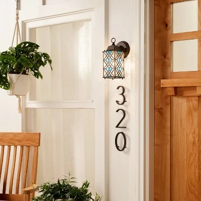 The 1-Light Traditional Black Satin Outdoor Stained Glass Lantern Wall Sconce from River of Goods will grace your entryway, porch or patio with a lovely mix of timeless style and eye-catching detail. This stained glass outdoor light features a durable metal housing in a classic craftsman lantern design, while the artisan stained glass shade is constructed of 152 glass cuts to create a radiant diamond-shaped pattern in icy blue and clear hues, all crafted by hand using traditional artisan techniques. Perfect for entryways, patios or decks, this stained glass outdoor wall lantern is sure to bring an extra touch of color and style you’ll love.