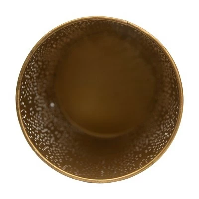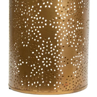 Stunning when lit up, this cylindrical pillar candle holder has an antiqued bronze finish. Pierced with a delicate floral pattern that creates a luminary effect with a lit or flameless candle inside. The warm tones of the antiqued bronze finish make this the perfect boho accent to lighten up your space.