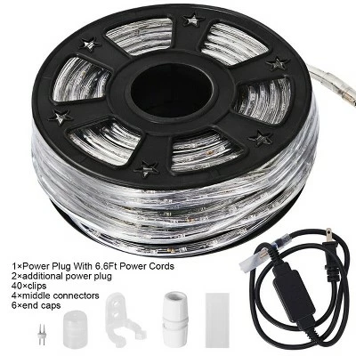 This is our Warm White Two-Wires LED Rope Lights that are versatile and nearly limitless uses in both residential and commercial lighting projects. Sub-miniature bulbs encase in flexible PVC tubing enhancing durability and easy to bend into shapes. Two-Wires features steady burn and much less energy consumed. Suitable for decorating or illuminating your home or business, creating figure or building sign display in many occasions such as corners, ceilings, staircases, decks, driveways, boats, galleries, clubs, parties and holidays. You can upgrade the rope lights for different lengths (longer or shorter) or several colors with two power cords and two power connectors. Specification: Note:The joints cannot be exposed due to the power cords and power connectors are non-waterproof. Length:100;LED Bulbs qty:11 Bulbs/ft. Power Cord Length:6.56’/2m;Tube Diameter:10.5mm;Bulb Orientation:Vertical. Beam Angle:45;Light Angle:360;Working Temperature:-20~60 degree centigrade. Rated life:50000h;Voltage:110V;Power Consumption:55W. Package Includes:1 x Led Rope With 6.6Ft Power Cords;2 x additional power plug;4 x middle connectors;6 x end caps;40 x clips.
