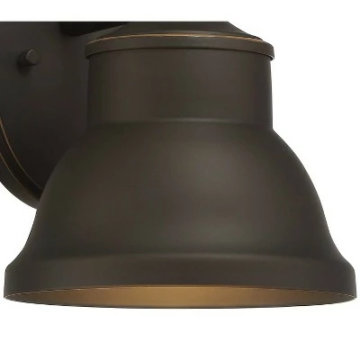 From Franklin Iron Works, this industrial outdoor wall light offers a handsome vintage look for an outside space. It comes in an oil-rubbed bronze finish frame, which consists of a round backplate and round attached shade that hangs downwards. Perfect for rustic industrial or classic urban style settings.