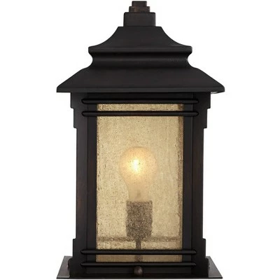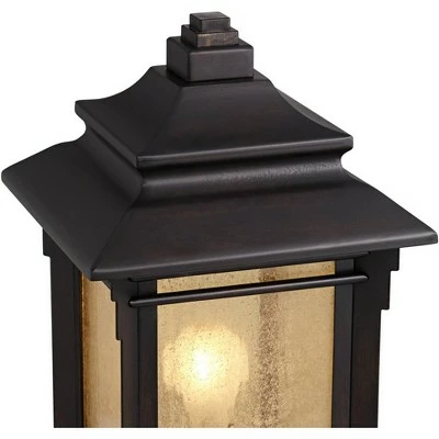 Inspired by traditional Mission Arts and Crafts styles, this outdoor pier light is a beautiful addition on top of a column or other flat surface. This classic design consists of a straight-lined frame, with a tiered top for a lovely architectural look. A walnut bronze finish adds a handsome touch, while textured frosted cream glass panels provide a warm and welcoming glow.