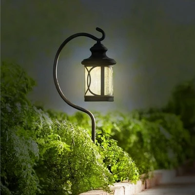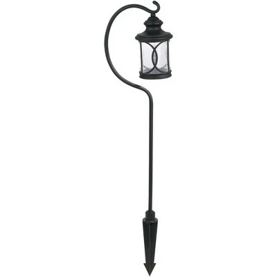 Illuminate your landscaping with this eight-piece energy efficient LED path and flood light set by John Timberland. Crafted of black finish aluminum, the light suspends from a shepherd’s crook style stand and its seeded glass lantern adds charm and safety to any yard or garden walkway or path. The energy-efficient, long-lasting LED means both no more time-consuming bulb changes and more lights on your transformer/system.