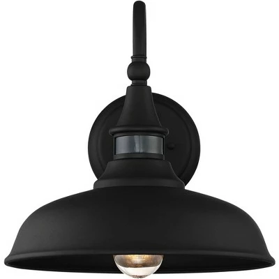 - Motion-sensor barn style outdoor wall light by John Timberland. Turns on at dusk to 25 percent brightness, then goes to full bright when motion is detected.