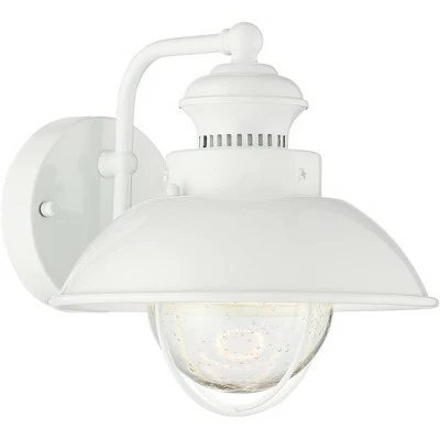 Update your outdoor lighting with this energy efficient LED outdoor wall light by the John Timberland® brand. A seedy glass orb surrounded by a small cage is paired with a soft white finish, creating a handsome look. Steel construction and cage around the bulb was inspired by industrial and barn light style lighting.