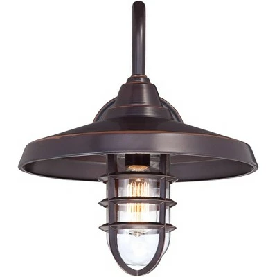 The Marlowe collection of outdoor lighting offers a creative combination of nautical style and industrial design. In a handsome bronze finish, this outdoor wall light features a thin, curving gooseneck with a wide-brimmed metal shade attached to the end. The stylish cage frame at the bottom protects a narrow glass shade, designed to house the bulb. Inspired by classic industrial and barn light designs.