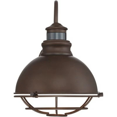 Perfect for a rustic or urban barn setting, this outdoor wall light comes in an oil-rubbed bronze finish over a steel frame. It has a prominently arching neck, with a round cage shade attached to the end. This industrial-style fixture is designed to shine light downwards and comes with a built-in motion sensor for extra convenience. Dual-bright design means the light turns on at 25% brightness and goes to 100% when motion is detected. Two minutes after motion is no longer detected, the light will revert to low-level brightness.