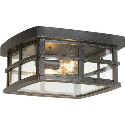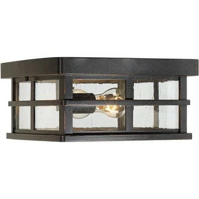 The rectangular frame and clean lines on this mission-style outdoor flush mounted ceiling light provide charming appeal. Clear seedy glass adds a rain-splashed look, while a pair of bulbs provide ambient illumination. Use this design on either side of a garage or entryway for extra curb appeal.