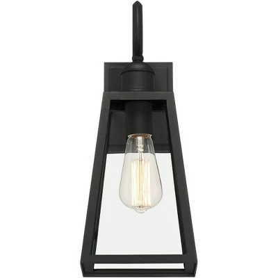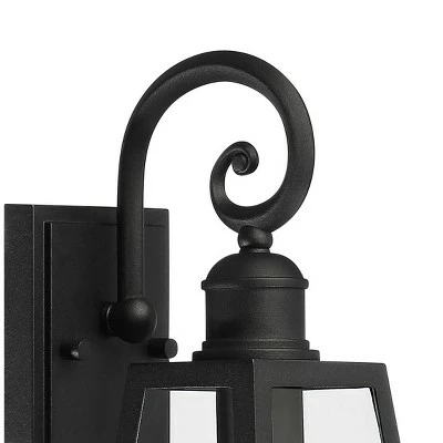 A pair of modern industrial wall lights are a perfect choice flanking a doorway or open wall space. From John Timberland®, this light pairs a simple open cage frame with a crisp black finish. A scroll arm adds decorative detail to complement a squared wall plate. Add a vintage-style bulb (not included) as pictured to add industrial character.