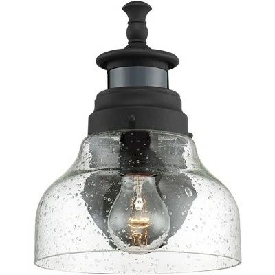 This classy outdoor wall light is perfect for contemporary or transitional settings. It comes in a black finish steel frame and has a clear seedy glass shade with an open bottom. This fixture also comes with a built-in motion sensor feature that turns on when it detects movement, adding an extra sense of security to your home. Also includes a dusk-to-dawn feature. Dual-bright design means the light turns on at 25% brightness and goes to 100% when motion is detected. Two minutes after motion is no longer detected, the light will revert to low-level brightness.