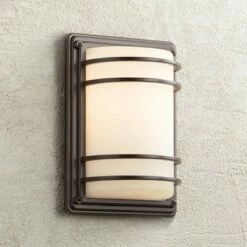This contemporary outdoor wall light offers a modern style statement for your home. From the John Timberland collection of home lighting designs, this pocket wall sconce features a handsome industrial look with a bronze finish steel frame. A protective etched glass shade gently diffuses the lighting for a softer effect. This fixture is a great addition to a porch or patio wall, and can also be installed indoors to illuminate hallways and more.