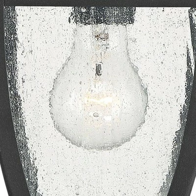 - Clear seeded glass panels allow bulb to be seen. Black finish frame and rectangular backplate.