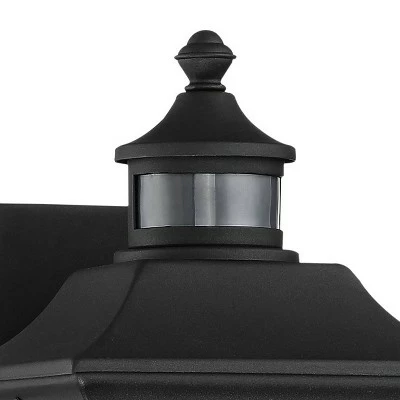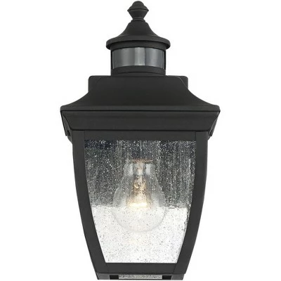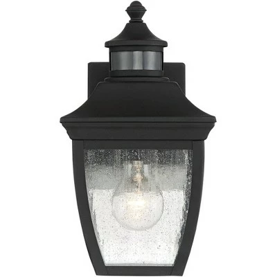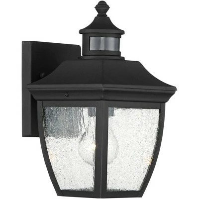 This outdoor wall light offers a charming, old-fashioned style for your home. It comes in a black finish frame that curves lightly in the middle for a shapely look. Seedy glass panels add a moody rain-washed effect. For extra security, lighting fixture includes a built-in dusk-to-dawn motion sensor feature. Dual-bright design means the light turns on at 25% brightness and goes to 100% when motion is detected. Two minutes after motion is no longer detected, the light will revert to low-level brightness.