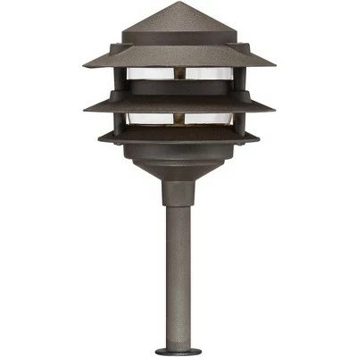 This complete landscape lighting set makes it easy to brighten outdoor spaces. It comes with 6 LED pagoda path lights, 2 LED spot lights for illuminating plantings or trees, a 45 watt transformer, and 50-feet of 12-guage wiring cable. Installation is a simple DIY job: Connect the lights together with the included wire, connect to the transformer, then plug into an outdoor grounded outlet. Path lights are in a bronze finish; spot lights are in a sleek black finish.