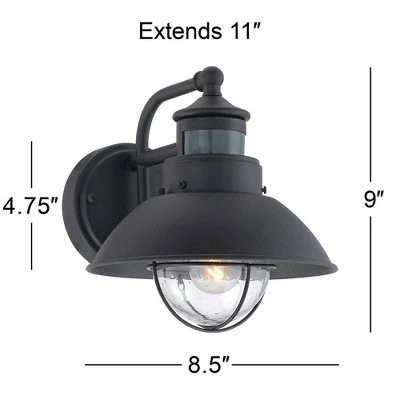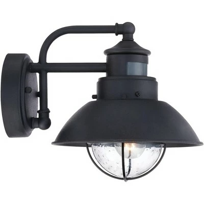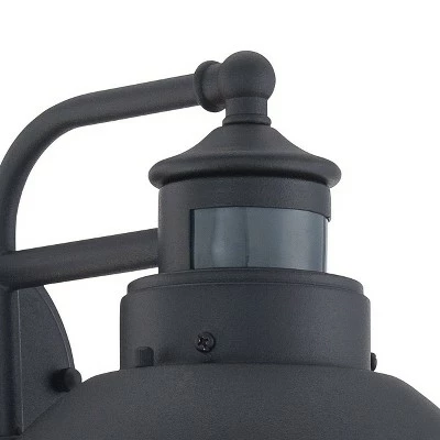 Inspired by classic Mission styles, this outdoor wall light fixture will add a traditional barn light look to your porch or patio. It comes in a handsome black finish over a steel frame, and has a round clear seeded glass shade that protects the bulb. Best of all, this design is outfitted with both a motion sensor and a dusk-to-dawn photocell sensor, giving you an extra sense of security. Dual-bright design means the light turns on at 25% brightness and goes to 100% when motion is detected. Two minutes after motion is no longer detected, the light will revert to low-level brightness.