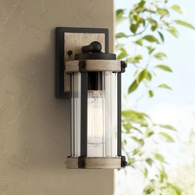 Vertical ribs in a clear glass shade add texture and eye-catching intrigue to this outdoor wall light from John Timberland®. This impressive wall light is perfect for an inviting front porch as it shows off a barnwood gray finish frame and distinctive black finish aluminum accents. This wall light is a single-light fixture that delivers a welcoming glow to your outdoor space.