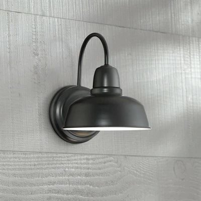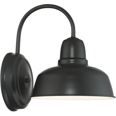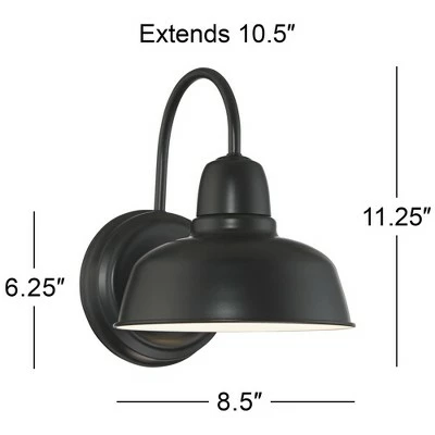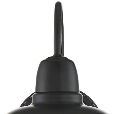 From the Urban Barn collection by John Timberland, this indoor-outdoor wall light comes in a charming industrial farmhouse style. The steel frame features a wide downlight shade attached to the end of a thin, arching gooseneck arm. A smooth black finish adds a classy and refined touch. Perfect for use in a porch or patio area.