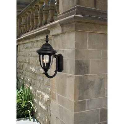 Brighten a porch, patio, or garage area with this classic and traditional outdoor wall light design. From the John Timberland brand and their Casa Sierra collection, the light features a carriage house style profile with a lower scroll arm and decorative clear seeded glass. The wallplate, arm, and light housing are all in a classic black finish and are crafted from a cast aluminum construction. The clear glass allows the three candelabra bulbs to be seen, and the design is show here with Edison filament style bulbs.
