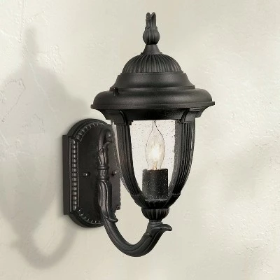 Classic traditional styling for outdoor porch or garage areas. Black finish with seedy glass panels for a distinctive antique look. From John Timberland®.
