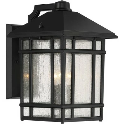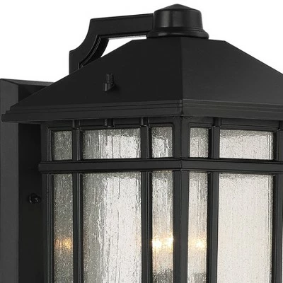 Add Americana styling from the Kathy Ireland Home J du J Sierra Craftsman Collection to your home. This outdoor wall light design was inspired by classic Arts and Crafts looks from the turn of the century. It features a black finish with clear seedy glass. With its clean lines and striking look, this is perfect for adding curb appeal to your home.