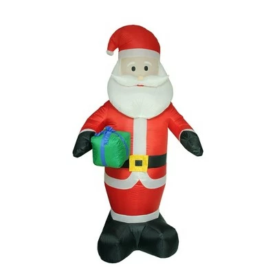 Make your outdoor space more attractive using this lighted Santa Claus with gift decoration. This inflatable decor yields an excellent way to decorate your lawn without any hassle. It is a must-have for homeowners who need their garden to be eye-catching.Product Features:Red inflatable Santa Claus holiday outdoor decorSanta Claus holding a green holiday present with blue bowDurable weatherproof nylonSelf inflates in minutesBlower included – simply plug this decoration in and it inflates and lights up in just a few minutes!Collapses quickly for easy storageAdditional Product Features:Pre-lit with cool white lightsUL certified and approved for indoor or outdoor use4 ground stakes and tether includedTransformer includedClass 2 power supplyInput: 120 volts, 60 hertz, 14 watts, 0.12 ampsOutput: 12 volts, 0.9 amps, 10.8 watts69″ lead cordDimensions: 96″H x 46″W x 40″DMaterial(s): nylon