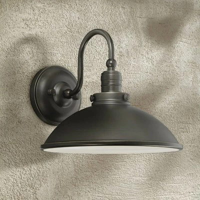 This large outdoor LED wall light gives you the charm of a traditional barn-style fixture in a modern, energy-saving package. Made of weather-resistant metal in an oil rubbed bronze finish with gold finish highlights, featuring a classic dome shade and a diffusing lens of rain glass. A Dark Sky-approved design from the Minka Lavery outdoor lighting Baytree Lane collection.