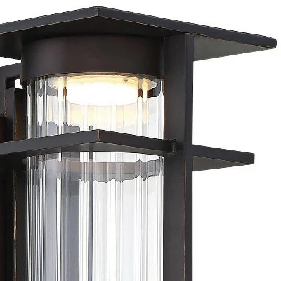 Update your home lighting options with this modern energy-efficient LED outdoor wall light from the Kittner collection by Minka Lavery. It features an Old World oil-rubbed bronze finish with gold highlights that gleams over the aluminum construction and is accented by a clear ribbed glass shade. The crisp lines throughout help make it a perfect choice for a home with modern decor.