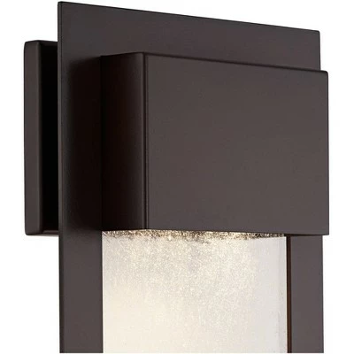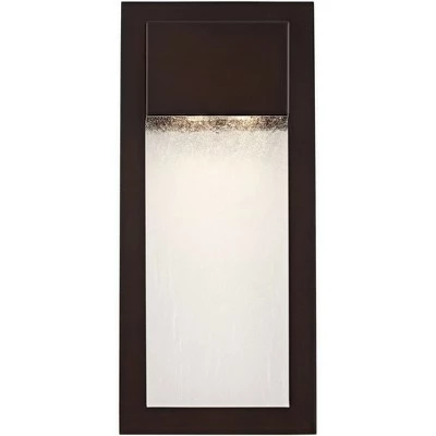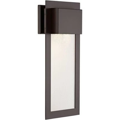 This simple modern outdoor wall light features a flat panel of clear seeded glass in front of two halogen bulbs. A metal trim frame in warm Alder bronze finish enhances the inviting geometric design. A beautiful addition to your home from Minka lighting.