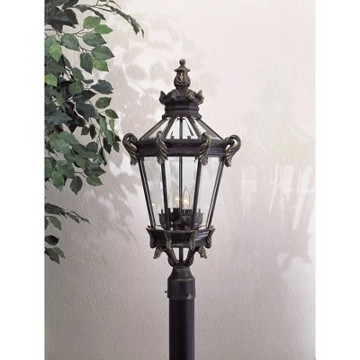 A traditional elegance inspires this beautiful outdoor post mount lantern. It offers timeless beauty with its beveled glass, metal candle sleeves and hand painted ornate Heritage™ finish with gold highlights. Pole not included.