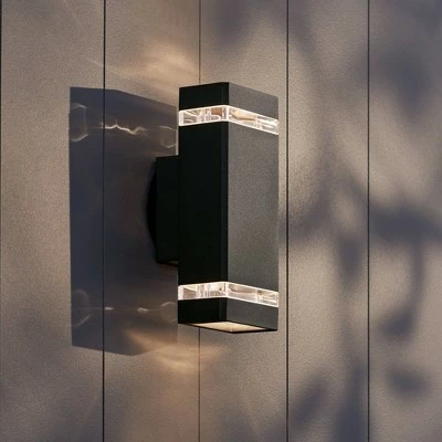 Outfit a contemporary space with this outdoor wall light from the Skyridge collection by Possini Euro Design. It comes in a sleek rectangular frame with a black finish and clear glass accents for a dash of visual interest. Specially designed to shine light from both ends, this fixture can be installed vertically or horizontally to best suit your decorating needs.