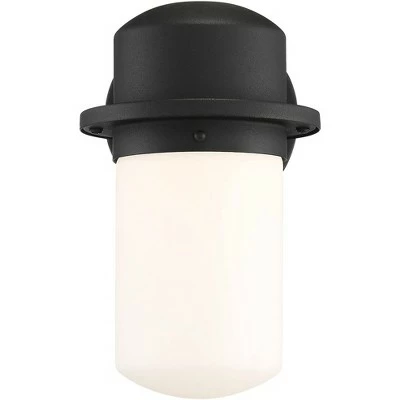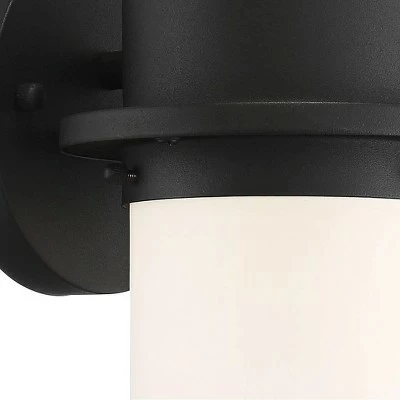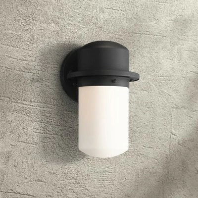 This energy-efficient LED outdoor wall light from Possini Euro Design® adds dazzling illumination while saving on energy costs. The simple rounded cylinder silhouette makes it a perfect fit for a variety of spaces, such as garages or porches. The opal white glass and textured black finish complement each other and provide a touch of modernism to the look.