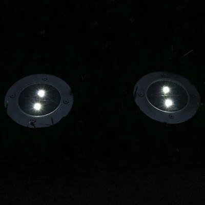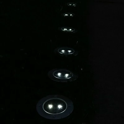 Illuminate any outdoor space well into the late hours of the night with the help of these warm white LED road stud solar lights. Place these lights outside a garden, near the deck, around a patio, along a driveway, around some favorite trees…the options are endless! These lights will be nearly flush with the ground when the stakes are pushed through the grass. Lights only raise 0.75″ above the ground. During the day, simply place the round solar lights in a location with direct sunlight to charge the AAA Ni-MH battery. When fully charged, the battery can run for 6-8 hours. No electricity or wiring is required, just place the solar light in the sun, let it charge, and enjoy an illuminated backyard space! Images include product in nighttime environment.